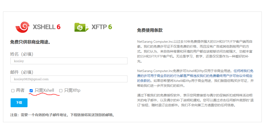 填写姓名、邮箱,勾选只需要Xshell,点击下载
