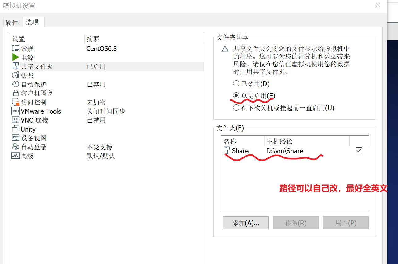 打开虚拟机设置,在选项卡页设置共享文件夹