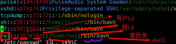每行的含义:用户名:口令:用户标识号:组标识号:注释性描述:主目录:登录Shell