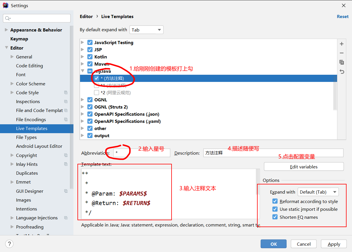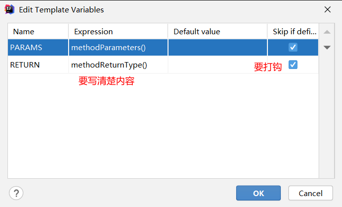 Edit variables,一定要记得把勾都选上,return的值可以在下拉菜单找到,而Params的值请复制以下表达式groovyScript( "def result=''; def params=\"${_1}\".replaceAll('[\\\\[|\\\\]|\\\\s]', '').split(',').toList(); for(i = 0; i < params.size(); i++) { result +=' * @param ' + params[i] + ((i < params.size() - 1) ? '\\n' : '')}; return result ", methodParameters())