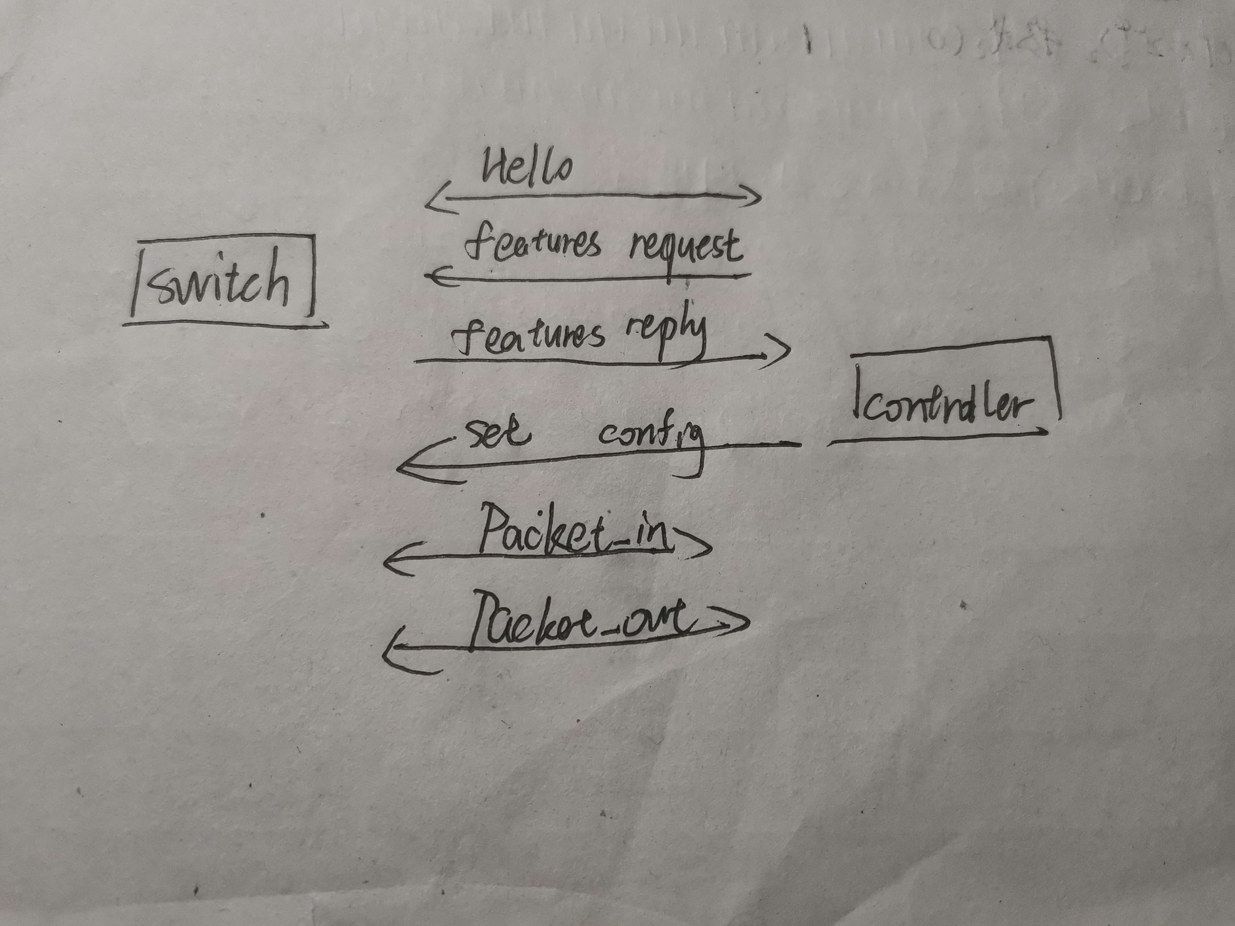- 查看抓包结果,分析OpenFlow协议中交换机与控制器的消息交互过程,画出相关交互图或流程图。