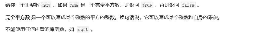 class Solution { public: bool isPerfectSquare(int num) { long long a = (long long)num; long long left = 0; long long right = a; while (left <= right) { long long mid = left + ((right - left) >> 1); if ((mid * mid) < a) { left = mid + 1; } else if ((mid * mid) > a) { right = mid -1; } else { return true; } } return false; } };