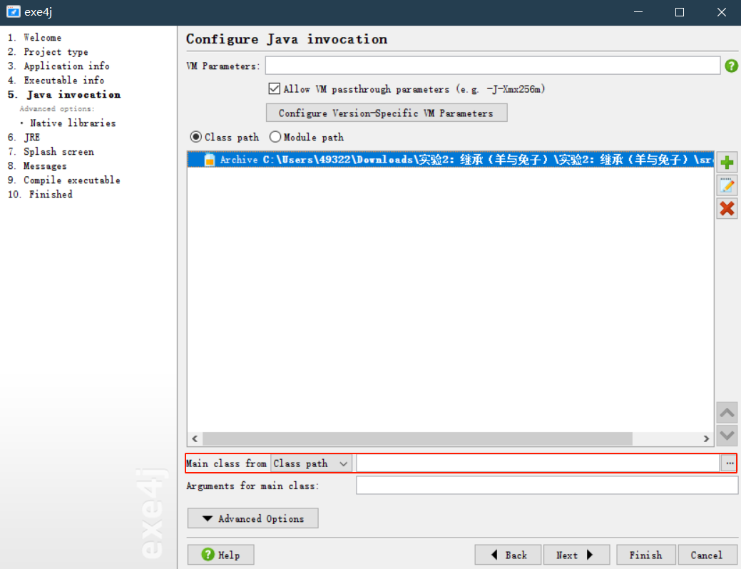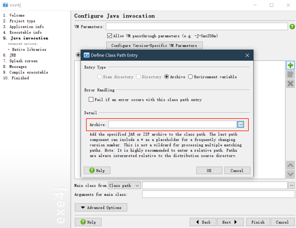 5.点击next到5.Java invocation,点击右侧绿色加号,选择需要打成exe的jar包,以及所依赖的jar包