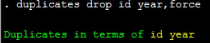 这是因为stata认为这样删除会让你丢失关于age的信息,所以它不允许。那如果age这个变量恰好是你不需要用的变量,这时候你可以加上force选项,这样id和year重复的两行就被删除了。