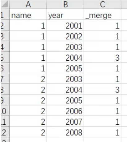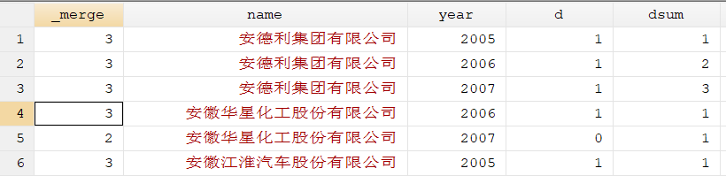 如何在同一个公司内,保留_merge==3当年以及之后年份的数据呢?
