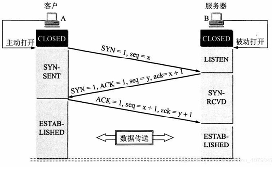 客户端收到B的确认后,还要向B发出确认,确认报文为ACK = 1,ack =y+1,seq = x + 1。A进入ESTABLISHED(已建立连接)状态,B收到A的确认后也进入ESTABLISHED(已建立连接)状态