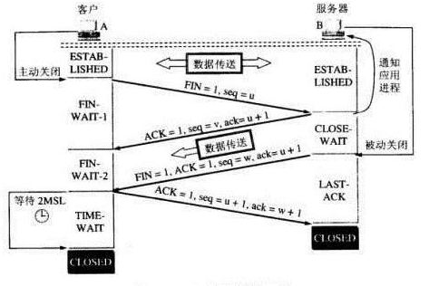 如图,主机A是客户端,B是服务器,起初两端的TCP进程都处于CLOSE(关闭)状态。主机下面的方框代表TCP进程所处的状态。