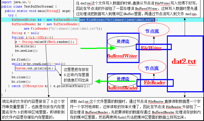 缓冲流要”套接“在相应的节点流之上,对读写的数据提供了缓冲的功能,提高了读写的效率,同时增加了一些新的方法