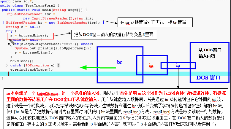 程序的输入指的是把从文件读取到的内容存储到为程序分配的内存区域里面去。流,什么是流,流无非就是两根管道,一根向里,一根向外,向里向外都是对于我们自己写的程序来说,流分为各种各样的类型,不同的分类方式又可以分为不同的类型,根据方向来分,分为输入流和输出流,根据读取数据的单位的不同,又可以分为字符流和字节流,除此之外,还可以分为节点流和处理流,节点流就是直接和数据源连接的流,处理流就是包在其它流上面的流,处理流不是直接和数据源连接,而是从数据源读取到数据以后再通过处理流处理一遍。缓冲流也包含了四个类: