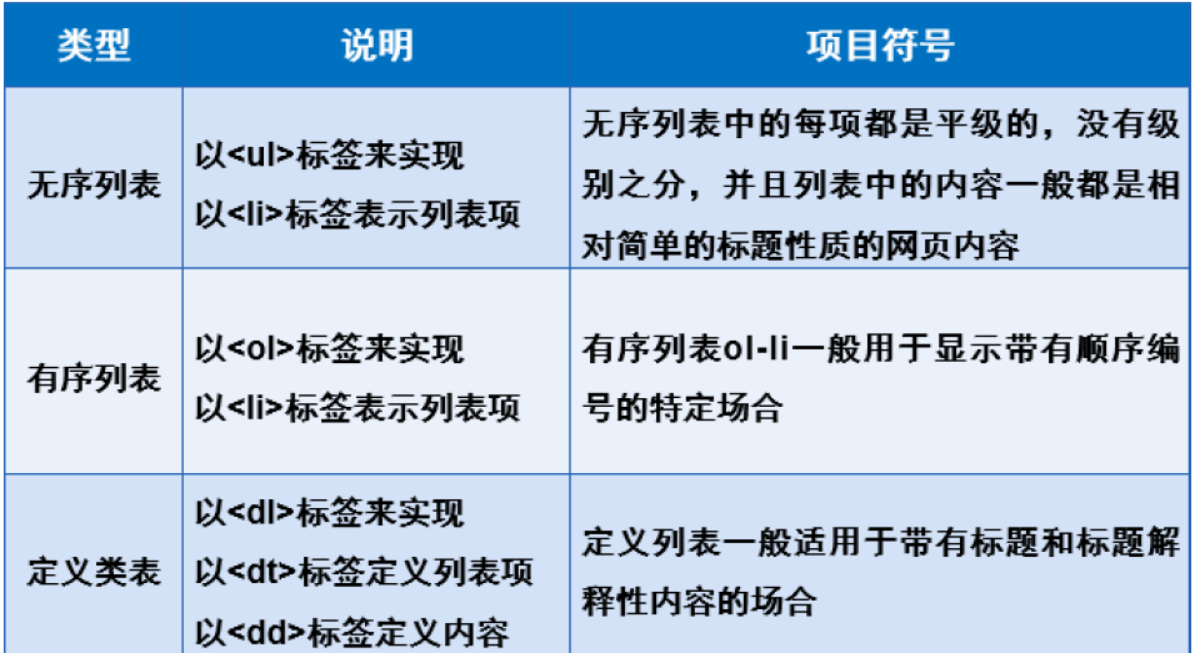 - 一般用于无序类型的列表,如导航、侧边栏新闻、有规律的图文组合模块等