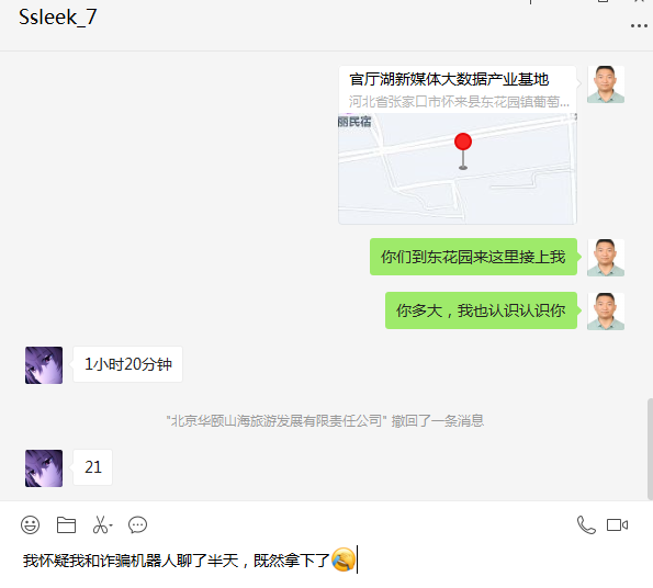 大晚上的,QQ有个人问我闹旅店的,说带团过来,让我交押金300,300不多,我差点就给了,奈何我QQ没费,加微信吧,想起了之前被骗的精力,多个心眼再聊会儿,想起来人工智能计算差,问他多大了,先发了个1小时20分钟,也许是我发地址他说到这里多久,但是后来又发了18,我思想已经确认是诈骗机器人了,截图留证,他又撤回发了21,呵呵~