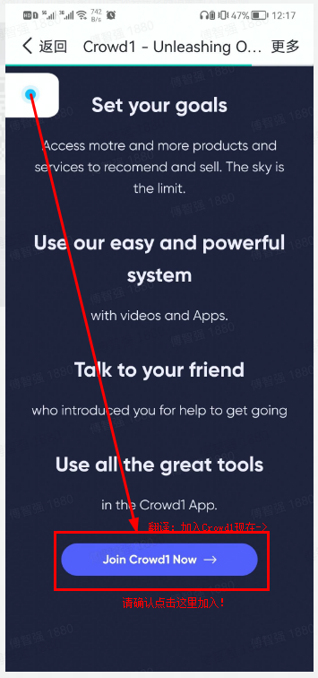 扫描二维码后请下滑页面到底部,点击Join Crowd1 Now ->按钮确认加入