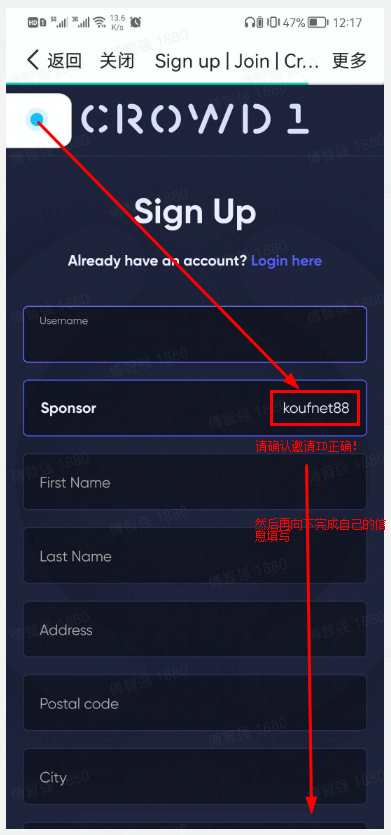 确认加入后会到注册页面,请先确认Sponsor为koufnet88