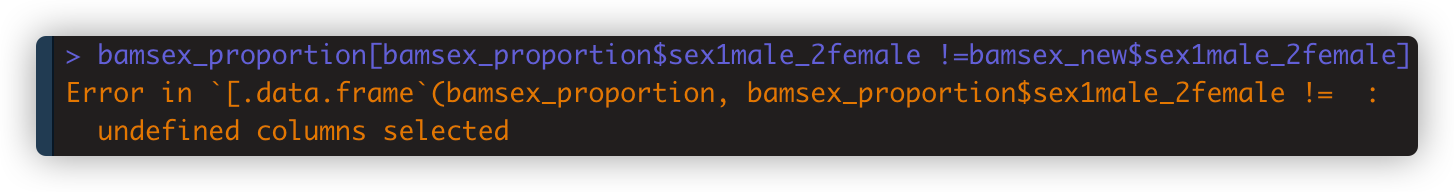 想取出两列数据对应不同的那行观测 ,一步实现不来如bamsex_proportion[bamsex_proportion$sex1male_2female !=bamsex_new$sex1male_2female]