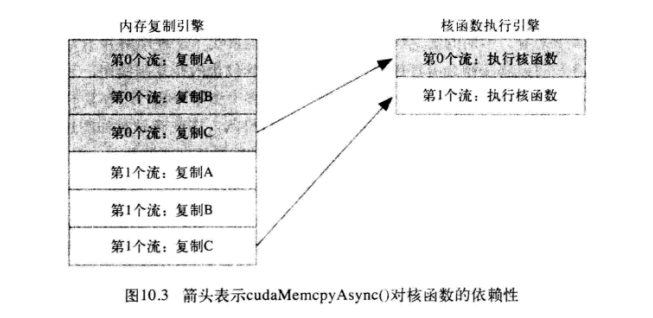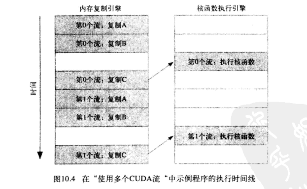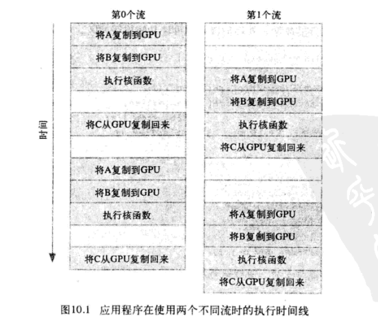 由于第0个流中将c复制回主机的操作要等待核函数执行完成, 因此第一个流中将a 和 b复制到GPU的操作虽然是完全独立的, 但却被阻塞了, 这是因为GPU引擎是按照指定的书序来执行工作。 这种情况很好得说明了为什么在程序中使用了两个流却无法获得加速的窘境。(gpu中流任务的执行顺序与代码中任务的先后顺序有关。)