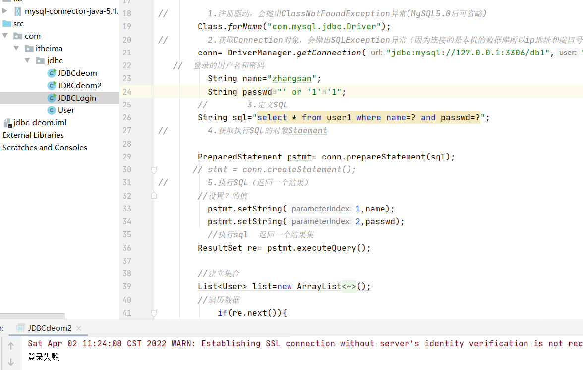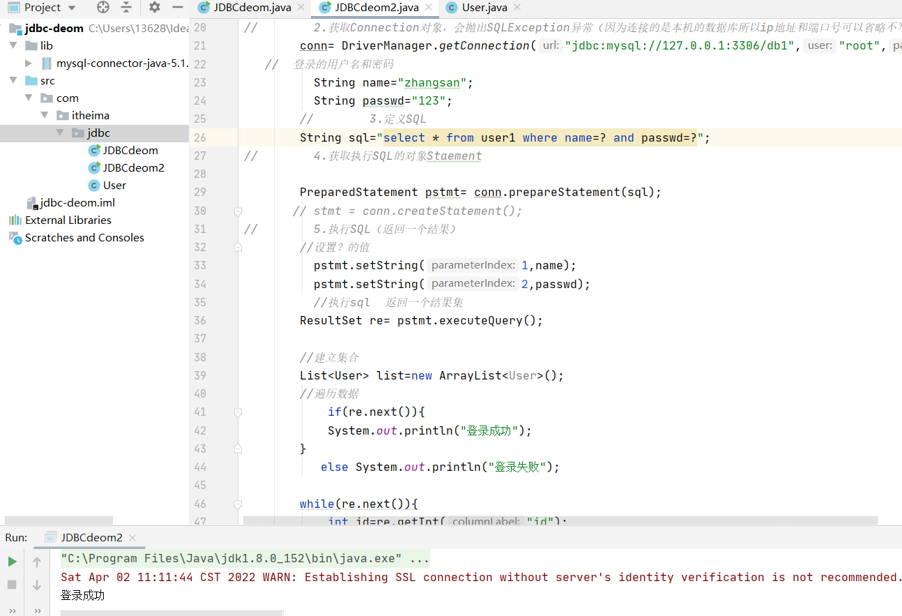conn= DriverManager.getConnection("jdbc:mysql://127.0.0.1:3306/db1","root","1234");
