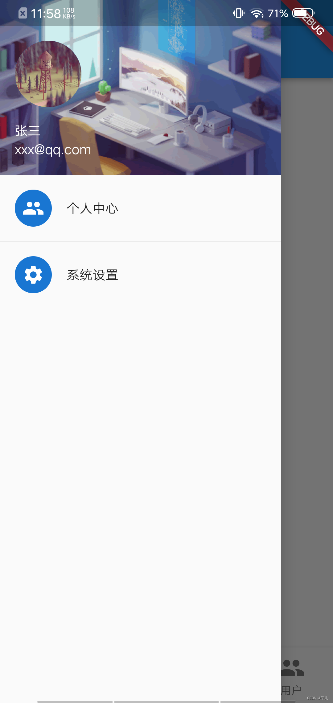 逻辑仍是给Drawer的child属性赋值为一个Column,里面有3个元素,第一个元素是DrawerHeader,第二、三个元素是ListTile。而之所以把DrawerHeader用Expanded包裹并放到Row中,是为了把DrawerHeader在水平方向上铺满(304dp),否则DrawerHeader的宽度是由其child的宽度和padding指定的left+right决定的,如果不人为指定等于Drawer的宽度的话,会出现Drawer内部右侧有一部分区域没有被背景图片或背景色覆盖的情况。