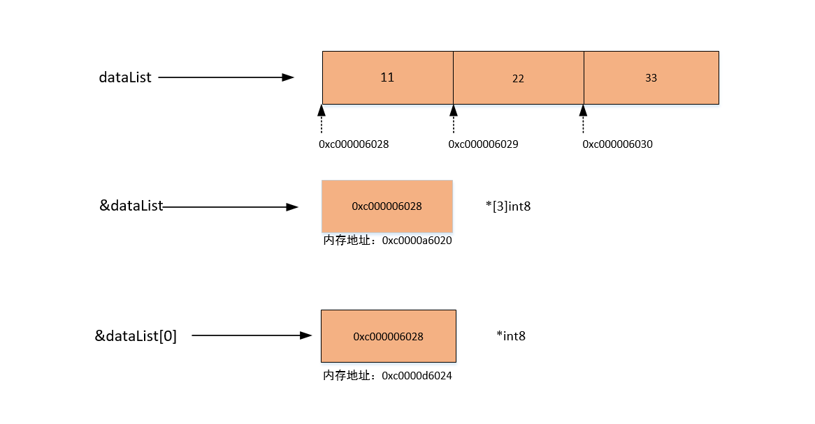 fmt.Printf("数组的地址为:%p; 数组第一个元素的地址为:%p", &dataList, &dataList[0])