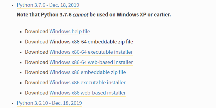 1.下载地址(以python 3.7.6,windows版本为例):https://www.python.org/downloads/windows/