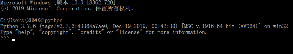 在dos命令窗口输入:python,如果出现以下画面就是安装成功了