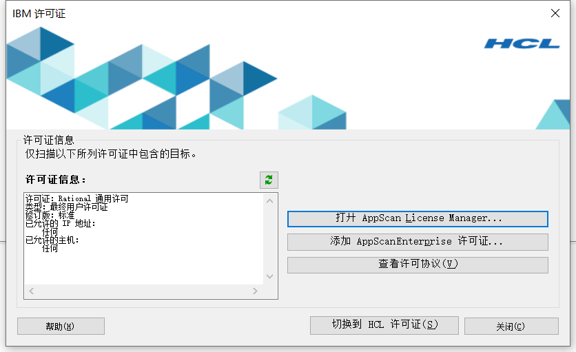 三、运行AppScan,点击“帮助”-“许可证”-“切换到IBM许可证”-“打开AppScan License Manager”-“许可证配置”,在“节点锁定许可证”下添加文件“AppScanStandard.txt”(注意:这个文件的路径不能带有中文),然后确定即可,配置完许可证的效果如下: