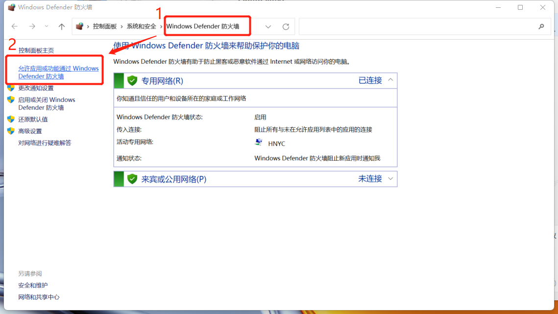 搜索“windows defender 防火墙“,点击”允许应用或功能通过windows defender 防火墙“