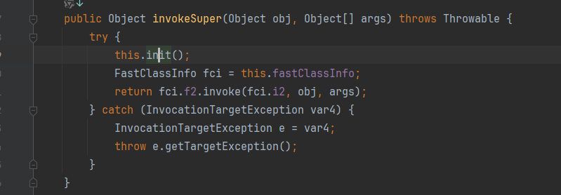 第二步:调用代理对象的方法,会进入到方法拦截器的intercept()方法,在这个方法中会调用proxy.invokeSuper(obj, args);方法