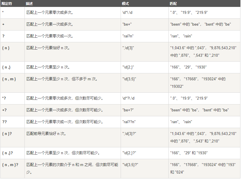 限定符指定在输入字符串中必须存在上一个元素(可以是字符、组或字符类)的多少个实例才能出现匹配项。 限定符包括下表中列出的语言元素。