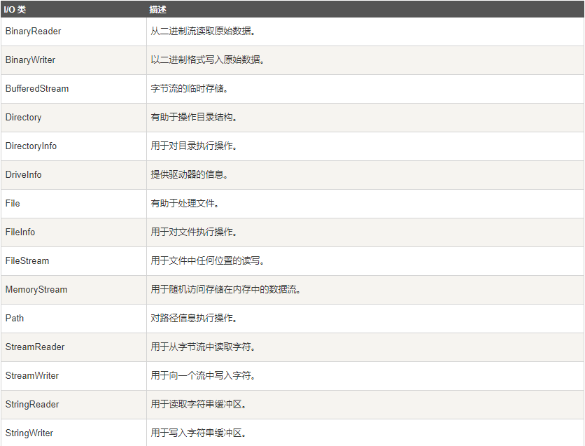 System.IO 命名空间有各种不同的类,用于执行各种文件操作,如创建和删除文件、读取或写入文件,关闭文件等。