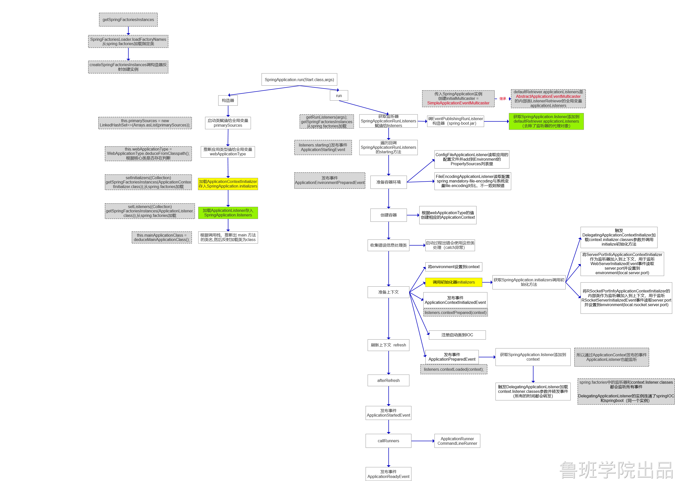 // 从spring.factories中加载key为 SpringApplicationRunListener.class对应的value值 并封装成返回的这个类实例 注意这个spring.factoies是在spring-boot.jar里面的 return new SpringApplicationRunListeners(logger, this.getSpringFactoriesInstances(SpringApplicationRunListener.class, types, this, args), this.applicationStartup); }