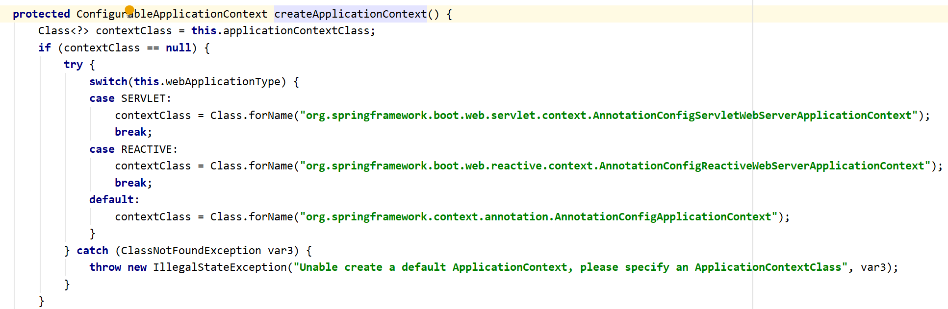 // 发布一个ApplicationContextInitializedEvent 事件 listeners.contextPrepared(context); if (this.logStartupInfo) { this.logStartupInfo(context.getParent() == null); this.logStartupProfileInfo(context); } ConfigurableListableBeanFactory beanFactory = context.getBeanFactory(); beanFactory.registerSingleton("springApplicationArguments", applicationArguments); if (printedBanner != null) { beanFactory.registerSingleton("springBootBanner", printedBanner); } if (beanFactory instanceof DefaultListableBeanFactory) { ((DefaultListableBeanFactory)beanFactory).setAllowBeanDefinitionOverriding(this.allowBeanDefinitionOverriding); } if (this.lazyInitialization) { context.addBeanFactoryPostProcessor(new LazyInitializationBeanFactoryPostProcessor()); } Set<Object> sources = this.getAllSources(); Assert.notEmpty(sources, "Sources must not be empty"); this.load(context, sources.toArray(new Object[0]));