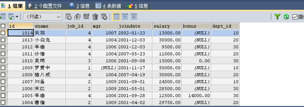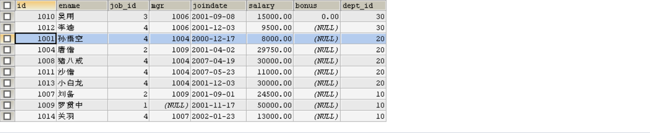 SELECT * FROM emp ORDER BY dept_id DESC , id ASC -- 先以dept_id进行降序,同以部门id进行升序