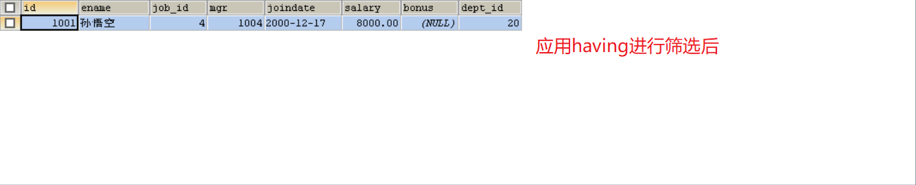 select * from emp Group by dept_id having salary between 1000 and 8000 -- 以部门进行分组,并且工资在1000 -8000之间