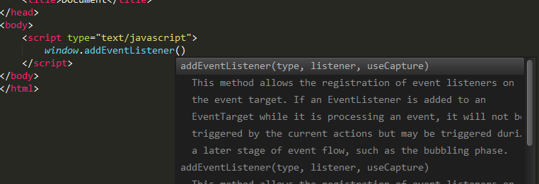 2)、SublimeCodeIntel 这个插件是对 html 效果很好,可以提示,如果想在 html 中写 js 代码 其中很多对象的方法和参数都记不清楚的时候,这个插件就有很大的用途,比如windows. 之后就会给你如下提示: