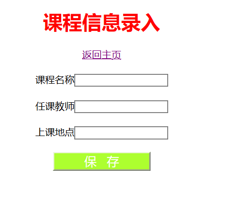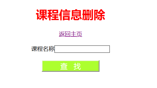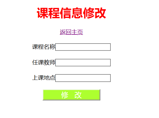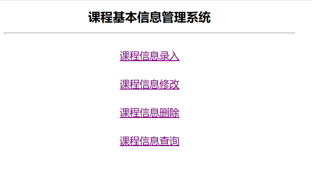 1 <%@ page language="java" contentType="text/html; charset=UTF-8" 2 pageEncoding="UTF-8"%> 3 <!DOCTYPE html> 4 <html> 5 <head> 6 <meta charset="UTF-8"> 7 <title>首页</title> 8 <style> 9 .a{ 10 font-size: 26px; 11 margin-top: 40px; 12 } 13 </style> 14 </head> 15 <body> 16 <div align="center"> 17 <h1>课程基本信息管理系统</h1> <!-- 系统主页 --> 18 <hr align="center" width="50%" /> 19 <div class="a"> 20 <a href="add.jsp">课程信息录入</a> <!-- 页面跳转 --> 21 </div> 22 <div class="a"> 23 <a href="CourseServlet?method=list">课程信息修改</a> <!-- 页面跳转 --> 24 </div> 25 <div class="a"> 26 <a href="del.jsp">课程信息删除</a> <!-- 页面跳转 --> 27 </div> 28 <div class="a"> 29 <a href="search.jsp">课程信息查询</a> <!-- 页面跳转 --> 30 </div> 31 </div> 32 </body> 33 </html>