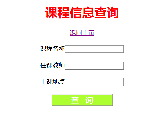 <%@ page language="java" contentType="text/html; charset=UTF-8" pageEncoding="UTF-8"%> <!DOCTYPE html> <html> <head> <meta charset="UTF-8"> <title>Insert title here</title> <style> .a{ margin-top: 20px; } .b{ font-size: 20px; width: 160px; color: white; background-color: greenyellow; } </style> </head> <body> <div align="center"> <h1 style="color: red;">课程信息查询</h1> <a href="index.jsp">返回主页</a> <form action="CourseServlet?method=search" method="post" onsubmit="return check()"> <div class="a"> 课程名称<input type="text" id="name" name="name"/> </div> <div class="a"> 任课教师<input type="text" id="teacher" name="teacher" /> </div> <div class="a"> 上课地点<input type="text" id="classroom" name="classroom" /> </div> <div class="a"> <button type="submit" class="b">查 询</button> </div> </form> </div> <script type="text/javascript"> function check() { var name = document.getElementById("name");; var teacher = document.getElementById("teacher"); var classroom = document.getElementById("classroom"); //非空 if(name.value == '' && teacher.value == '' && classroom.value == '') { alert('请填写一个条件'); return false; } } </script> </body> </html>