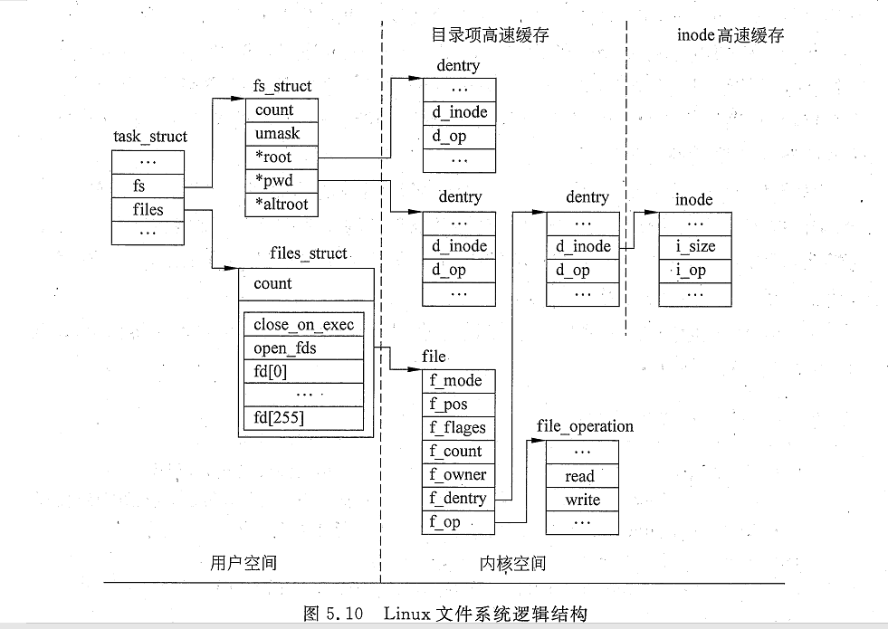 - 第一层为文件系统接口层,如open、write、close等系统调用接口。