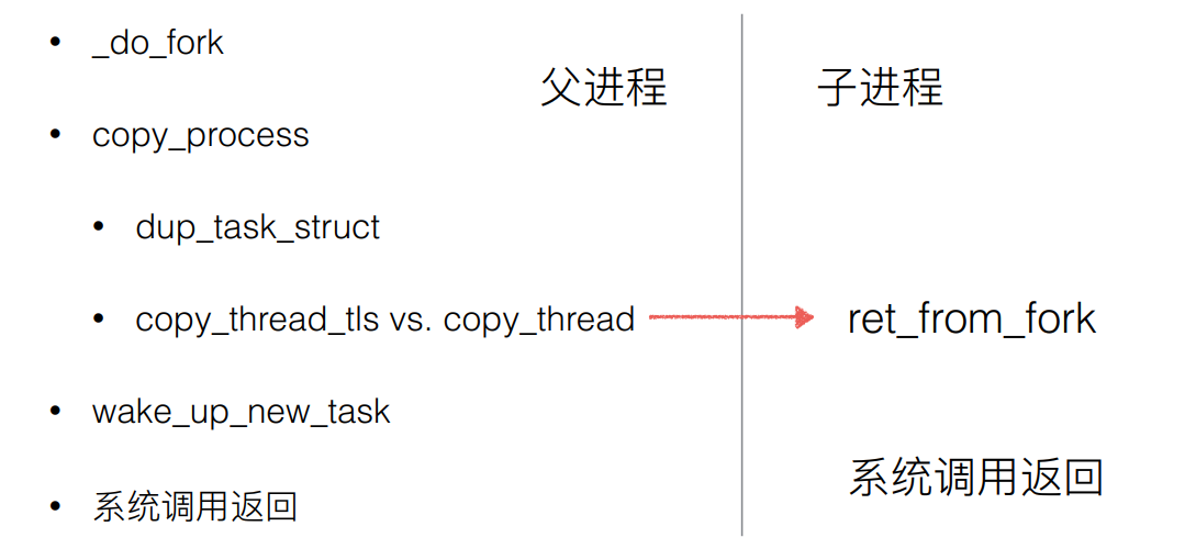 进程创建可以通过fork,vfork,clone三个系统调用实现,它们都是通过do_fork函数实现进程创建的,在do_fork函数中,以ret_from_fork函数为执行起点,复制父进程的内存堆栈和数据,并修改某些参数实现子进程的定义和初始化,创建子进程的工作完成后,通过sys_call exit函数退出并pop父进程的内存堆栈,实现新进程的创建工作。fork创建的新进程是和父进程(除了PID和PPID)一样的副本,包括真实和有效的UID和GID、进程组合会话ID、环境、资源限制、打开的文件以及共享内存段。根据代码的分析,do_fork中,copy_process管子进程运行的准备,wake_up_new_task将子进程加入到就绪队列等待调度执行。