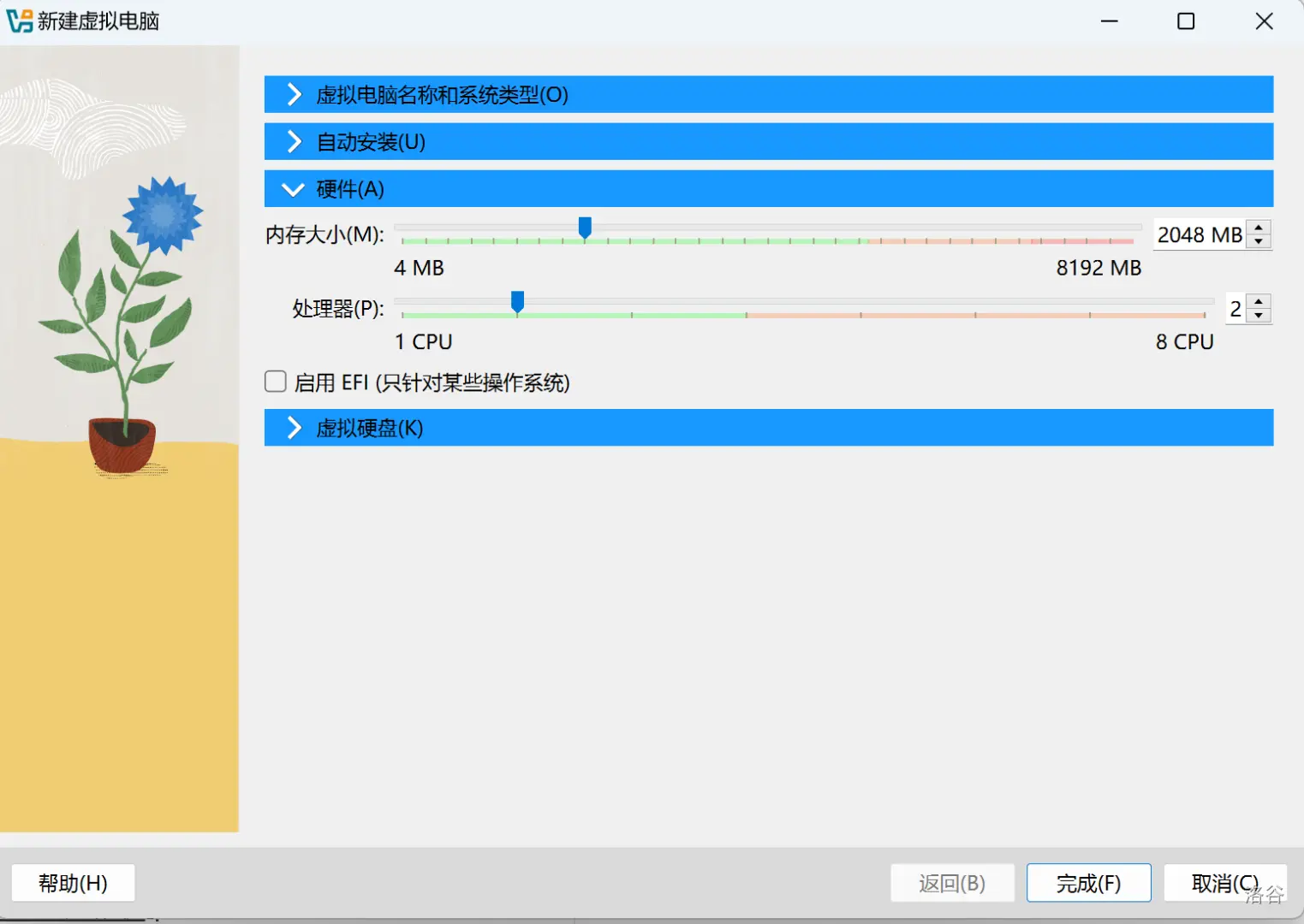 5、硬件选择内存(建议2G以上)和处理器核心数量(建议2个以上)。