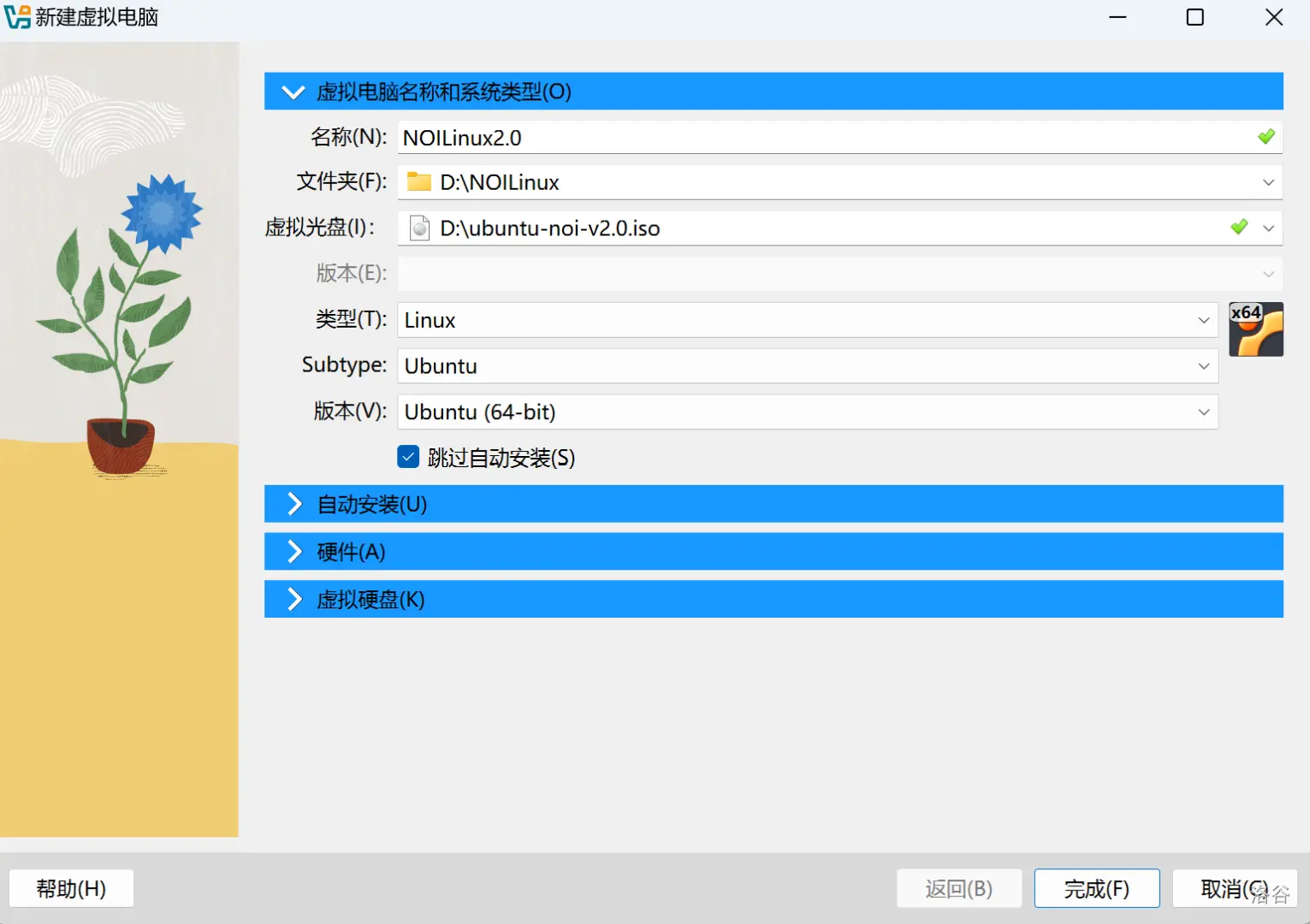 3、在新建虚拟机界面填写,虚拟机名称、安装文件夹、虚拟光盘(选择NOI Linux 2.0),并勾选跳过自动安装。