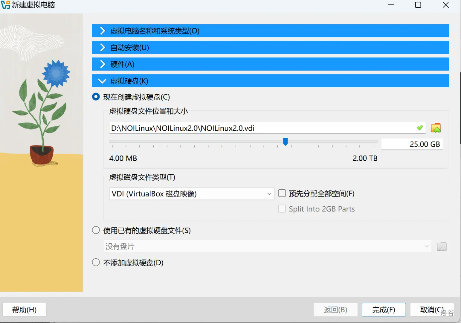 6、虚拟硬盘根据需求设置大小(默认25G可以设置更多)。