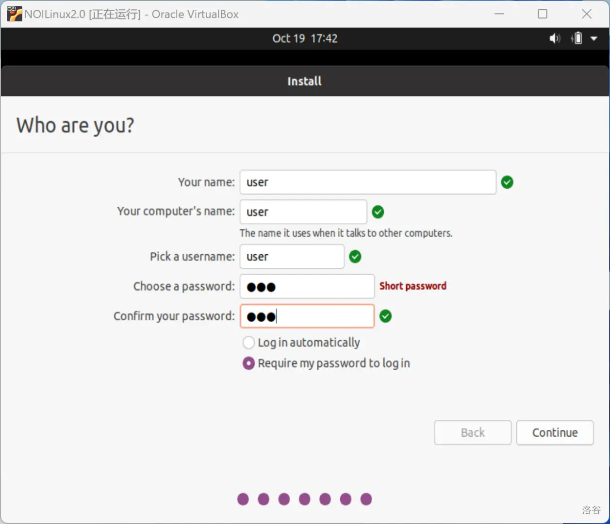 10、等待虚拟机自动安装系统到语言选择这一步。所有的设置都可以选择默认设置,直到需要设置用户名和密码。根据自身情况设置好用户名密码(我的用户名:user 密码是:123)