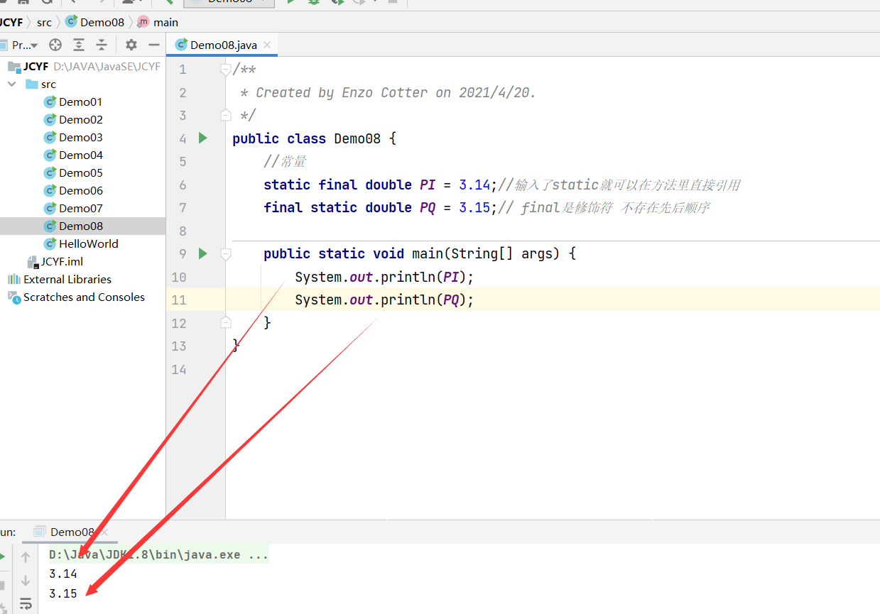 常量可以理解为特殊的变量,它的值被设定后,在程序运行过程中不允许被改变! 关键字为:final