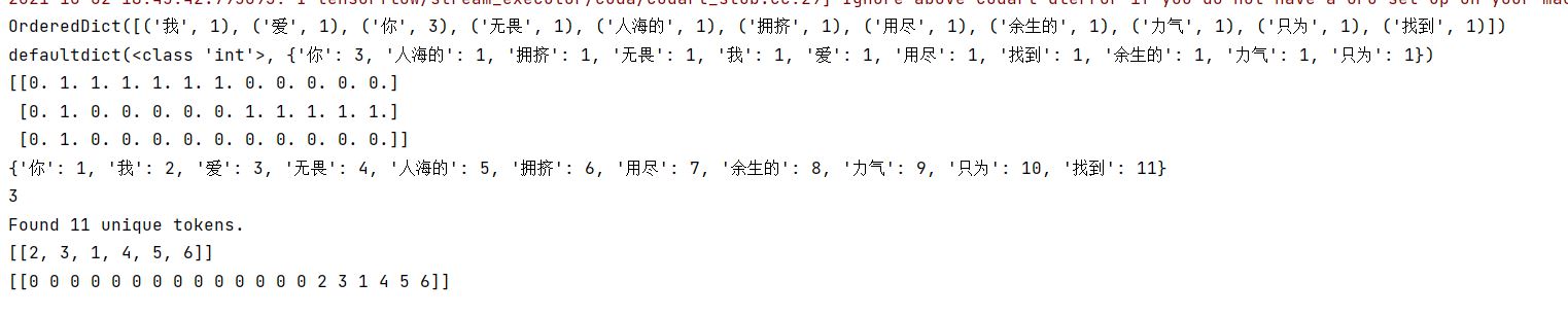 import keras.preprocessing.sequence from keras.preprocessing.text import Tokenizer samples = ['我 爱 你 无畏 人海的 拥挤','用尽 余生的 力气 只为 找到 你','你'] # 创建分词器实例 # split 默认字符为空格 tokenizer = Tokenizer() tokenizer.fit_on_texts(samples) # word_counts:字典形式 出现过多少次 print(tokenizer.word_counts) # word_docs: 字典 print(tokenizer.word_docs) one_hot_results = tokenizer.texts_to_matrix(samples) print(one_hot_results) # 获得单词索引 word_index = tokenizer.word_index print(word_index) #document_count: 整数 几个字符串 print(tokenizer.document_count) print('Found %s.'% len(word_index)) print(tokenizer.texts_to_sequences(["我 爱 你 无畏 人海的 拥挤"])) print(keras.preprocessing.sequence.pad_sequences(tokenizer.texts_to_sequences(["我 爱 你 无畏 人海的 拥挤"]),maxlen=20))