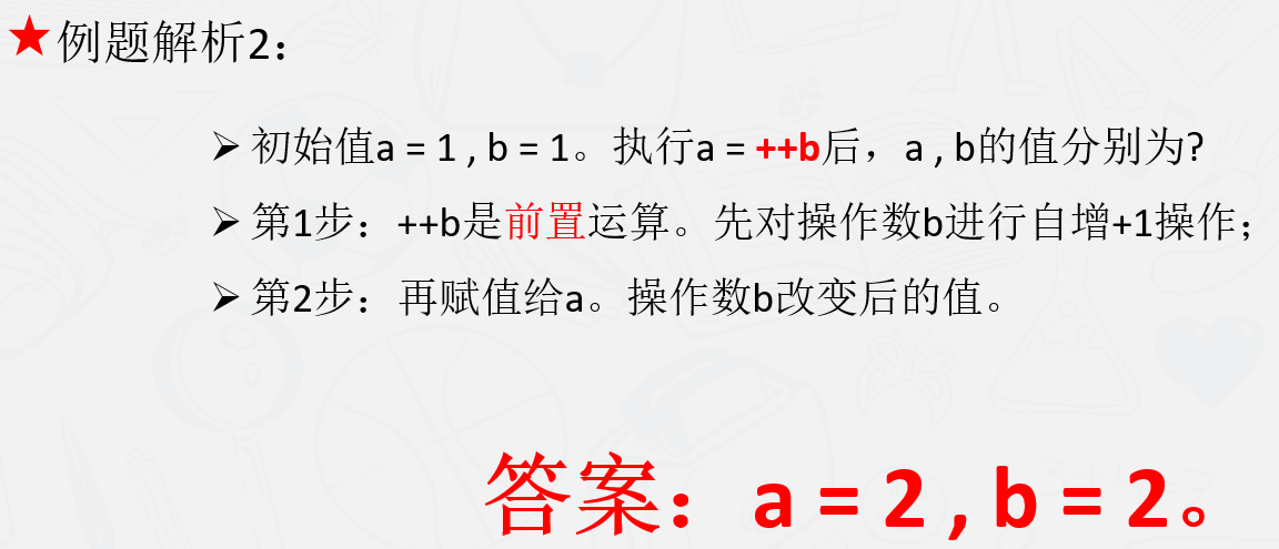 前置运算:先对操作数进行自增(减)操作,再返回表达式(操作数改变)的值;