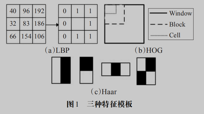 图 1给出了三种手工特征模板。LBP特征(局部二值模式)如图 1(a)所示,模板中心周围的像素值均与模板中心像素值比较,大于中心像素值为1,小于中心像素值为 0。从模板左上角开始,顺时针旋转组成的二进制数对应的十进制数即为中心点像素值。Ojala 等人对LBP特征做出改进,提出了具有灰度不变性和旋转不变性LBP特征。LBP特征对光照具有很强的鲁棒性,针对的是物体的纹理特征,当物体纹理与背景纹理相似时,会降低检测效果。HOG 特征如图 1(b)所示,Block 在Window 内滑动,内部包含多个 Cell。Block 内所有 Cell的梯度直方图串联即为 Block 的梯度直方图(Block 的HOG 特征描述),为了获得光照不变性和阴影不变性,需要对比度归一化 Window 内重叠的 Block。Window内所有 Block 的梯度直方图串联即为 Window 的 HOG特征描述,通过滑动窗口,收集整幅图片的 HOG 特 征。HOG特征提取的是物体边缘特征,对图像中的噪声敏感;图1(c)所示是四种基本Haar特征,每种特征特征值等于白色区域的像素和减去黑色区域的像素和。Haar特征利用灰度图中物体表面明暗变化提取特征,因 此Haar特征对光照鲁棒性很差。