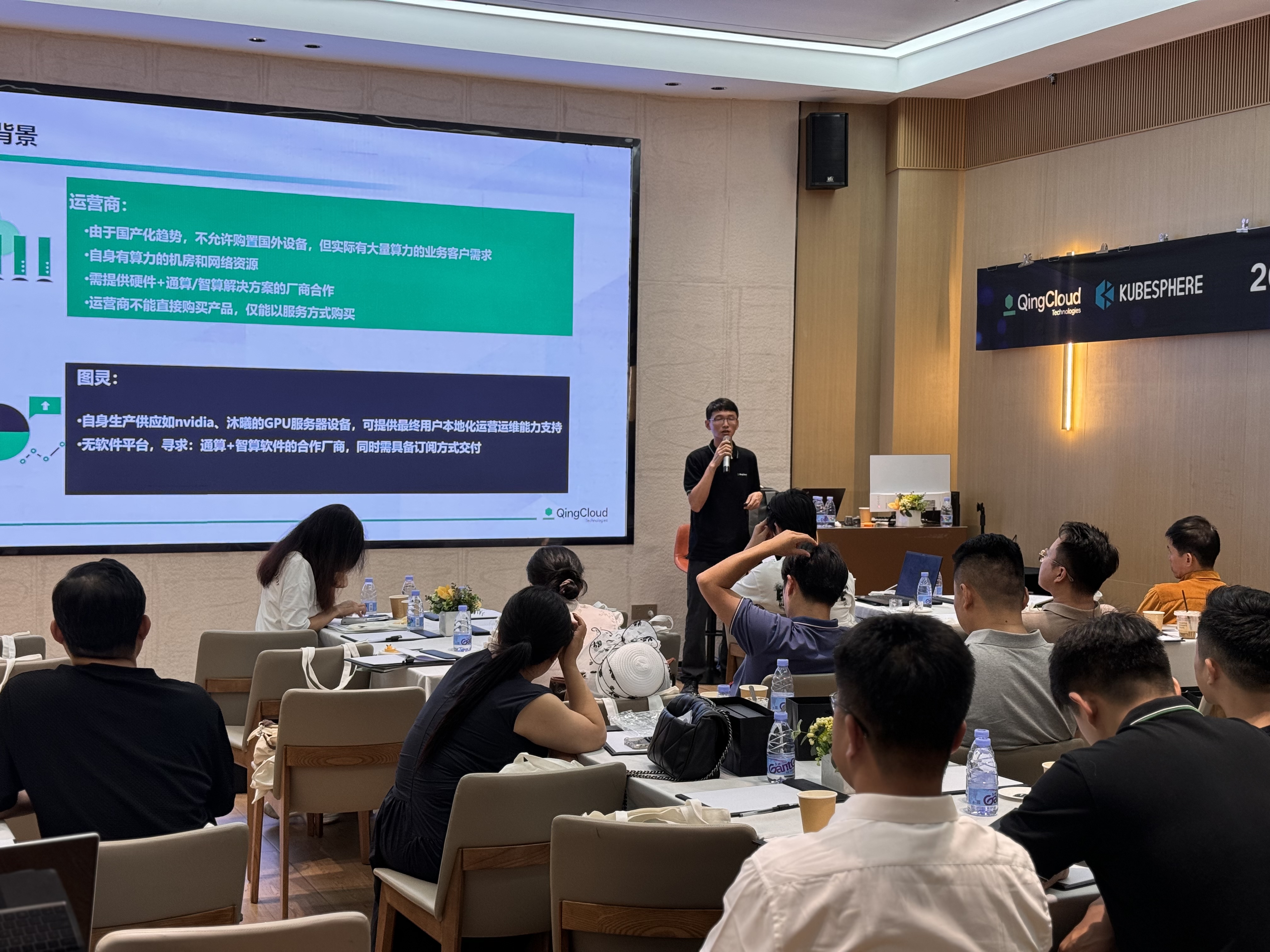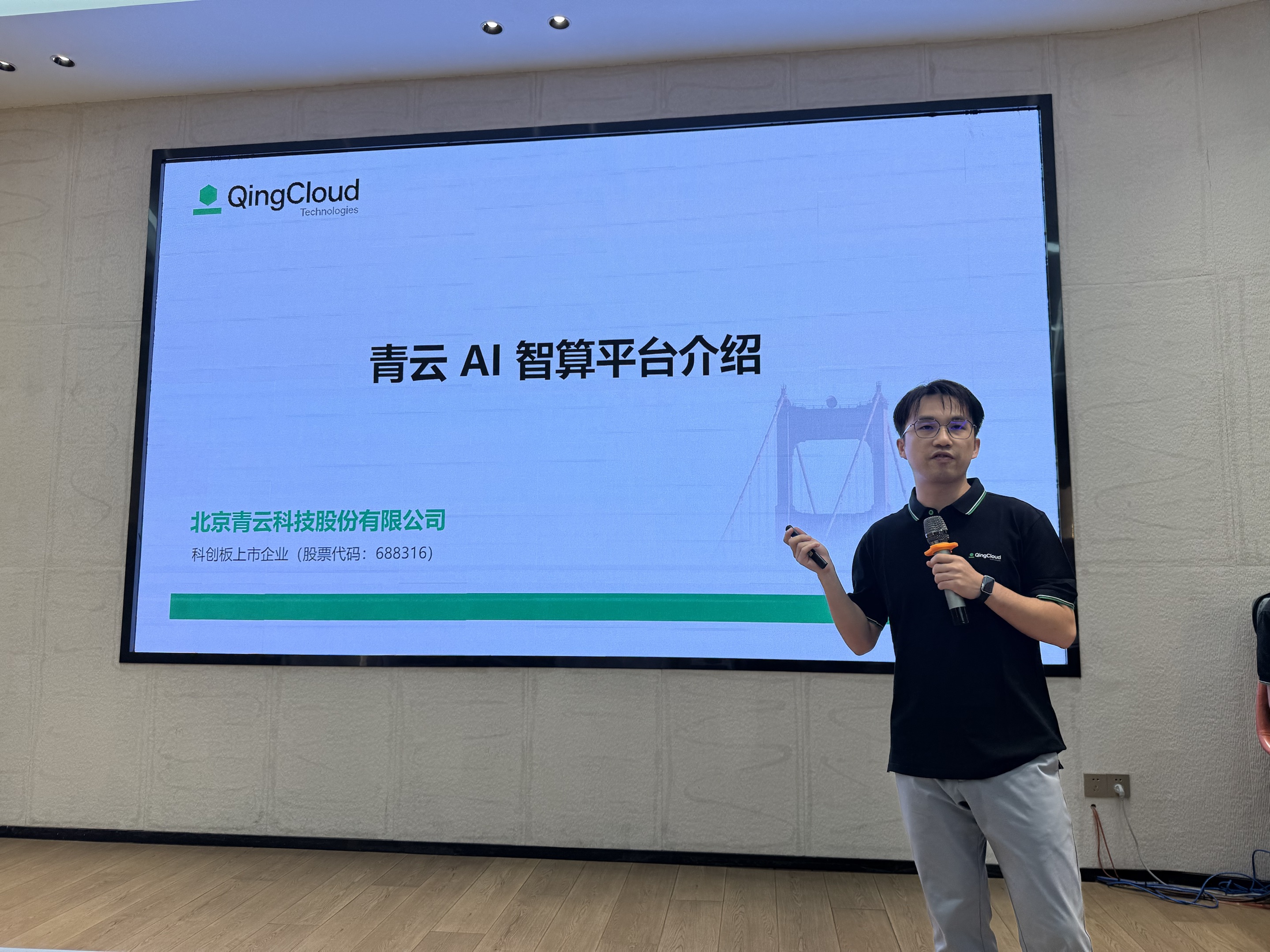 在技术分享环节,青云科技解决方案架构师廖银锋带来了企业客户落地场景中的实战经验。他以“智算调度 + 云原生平台”的深度融合为主线,讲解了如何以标准化平台提升系统弹性、加快迭代速度并降低整体运维成本。