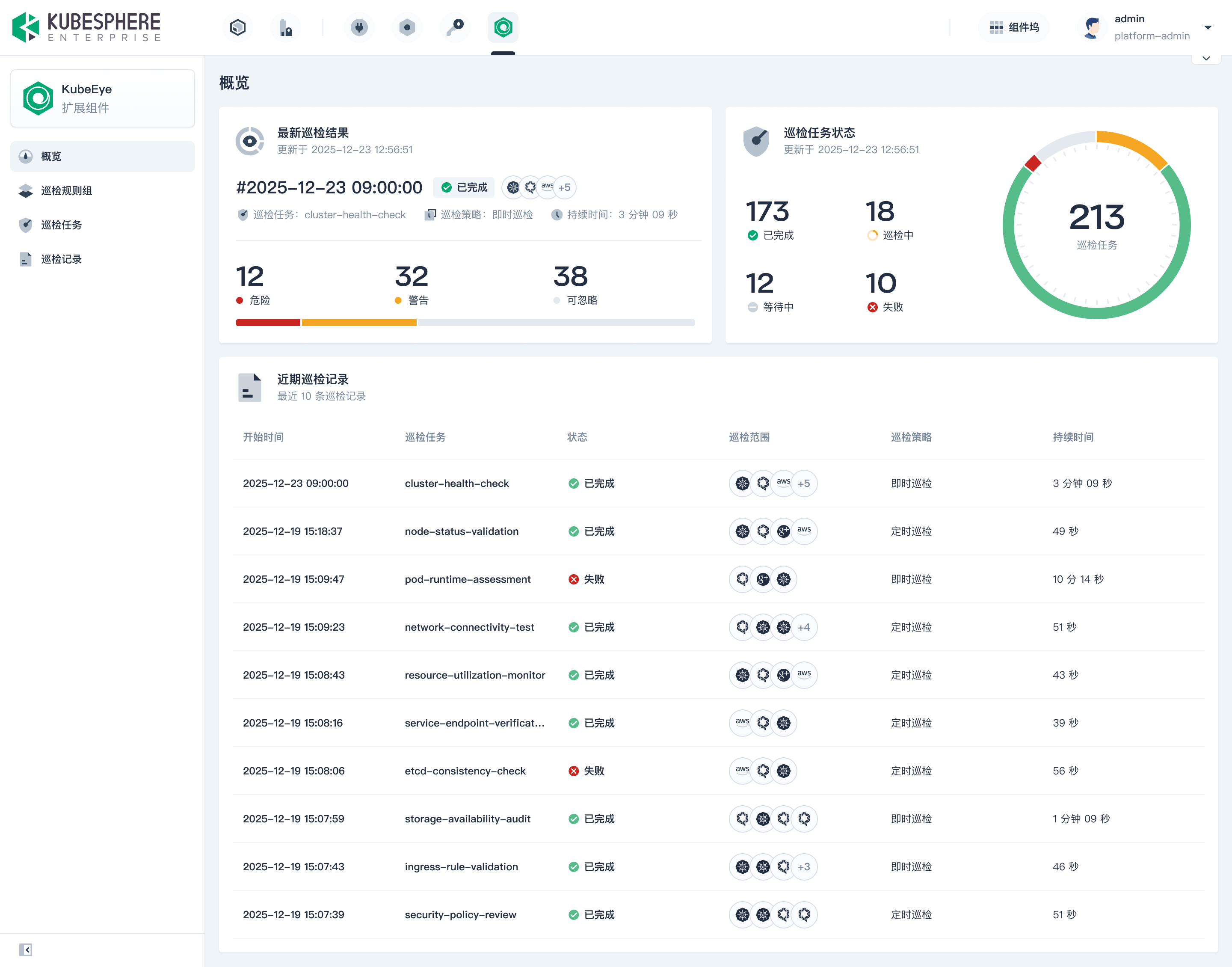 KubeSphere v4.2.1 通过 KubeEye 提供灵活且可扩展的 K8s 集群巡检框架。KubeEye 支持通过自定义巡检规则和计划,对集群中的节点、工作负载及服务进行全面的自动化健康检查与合规性扫描,并自动采集结果、生成详细的巡检报告,帮助管理员提前发现潜在风险与配置缺陷。