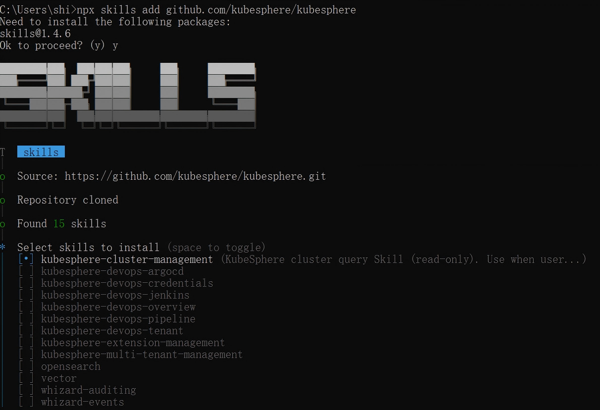 请帮我安装 https://github.com/kubesphere/kubesphere 中的 skills