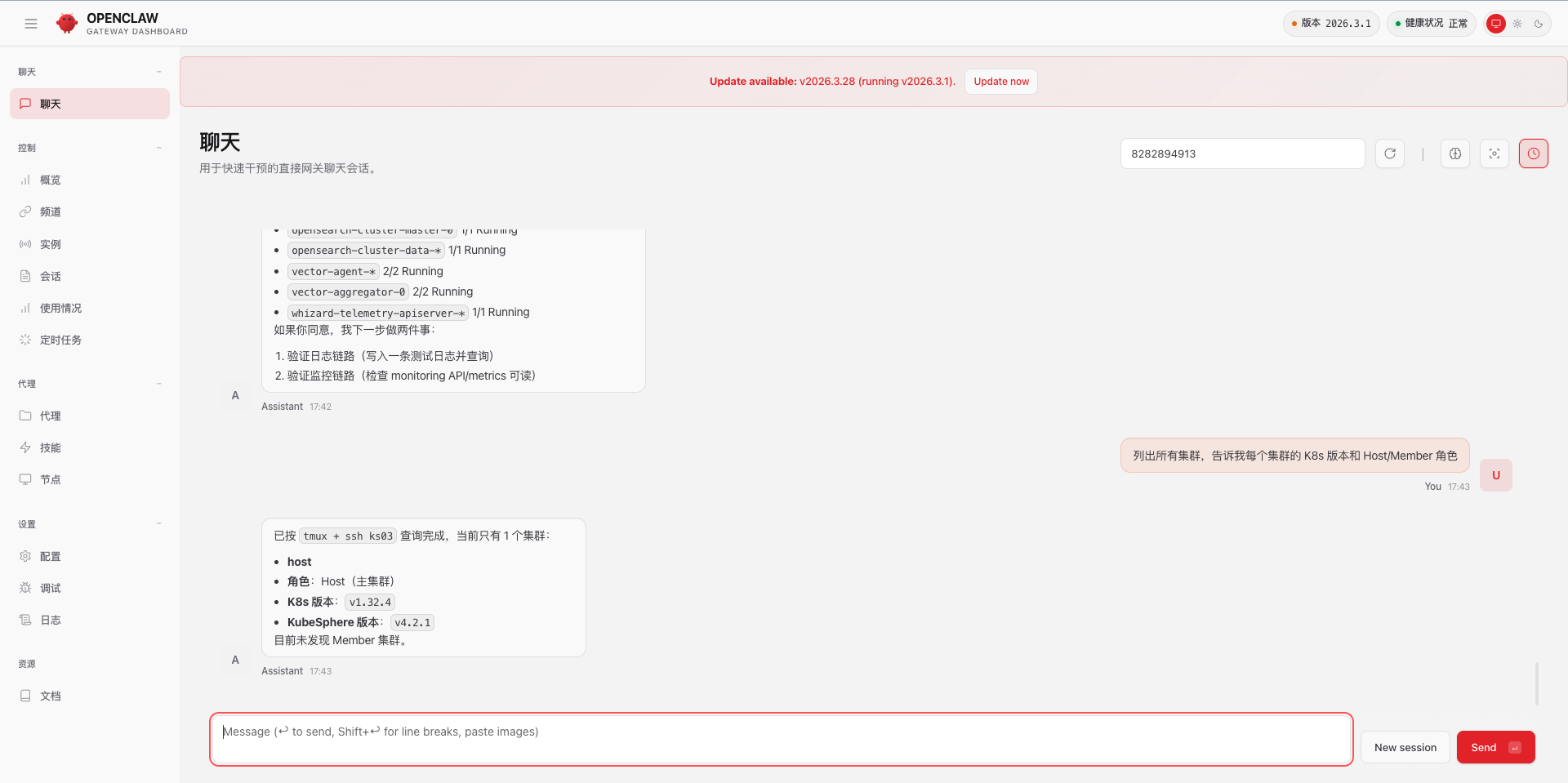 加载 KubeSphere Skills 之后,OpenClaw 不再只是输出一套通用 K8s / DevOps 方案,而是开始按照 KubeSphere 的资源模型、安装方式和操作路径 来理解问题,并给出更贴近实际工作流的回答。